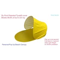 This unique POP-UP beach mat with sun shade cover is made from Du Pont Tyvek? which is a patented high-tech fabric created by DuPont from high-density polyethylene (HDPE). Tyvek? is an extremely versatile material, it has superior protection against sun's UV rays, it can block out 99.8% of harmful UV rays which is the main source causing sunburn. It is ultra thin and light weight, feel like paper yet it is very strong and extremely durable. Tyvek? also resists water penetration but it allows vapor to pass through. it is a perfect material for beach sun shelter and tent applications.The pop up beach mat with sun shade will pop open within in one second, folds back within 3 second into a 15cm dia. circle. It is very light weight 1.5 lb, double shoulder straps make it easier to carry. This beach sun shelter is designed for adult use, Mat size: 161cm x 94 cm. Cover size:192 cm x 85cm , Height :82cm. Sun shade cove can be easily adjusted to different angles to change the shaded area. To view the video instructions, please copy and paste the following link into your browser: http://bmgopen.com/sunshelter-flash/flash.swf