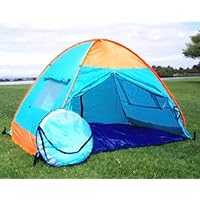 This is a brand new beautiful Family Cabana Tent. It pops up quickly and folds down easily (no poles needed). The cabana filters out harmful UV rays to protect you from sun, wind and rain. This affordable pop-up shelter tent is ideal for 3 season camping, beach camping, changing and privacy, backpacking, picnic and other outdoors events. It is also an excellent place for kids to play indoors or outdoors This Great Camping Gear Features: -Sizes 82"wide x50"deep x 52"high -UV protection rated 45 SPF -Easy to use - put it up in seconds and folds down in minutes -The back flap opens to allow great breeze -Mesh panels on both ends -The front can be completely closed with zipper for privacy -Sand pockets along the bottom for stability -There are pegs in the package for strong wind -Colors: Bright light blue and brilliant orange -Comes with a handy stack to carry it in -The tent weighs 6lbs and backpack is about 20" in diameter This tent is the best of all pop up tents. It is beautifully designed and easy to set up. The tent is brand new and never be used. However, there are some stains which left during the fabric dyeing process.