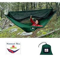 (More customer reviews)I have gotten into hiking and wanted to replace my tent to cut weight and actually get a decent nights sleep for a change. After reviewing about every hammock out there I purchased the Hammock Bliss. I got it fairly quickly but was worried about set up as I had no time to practice before my trip this past weekend. We went to Stone Mtn NC with 3 other guys and the daytime temp was 74 and the nighttime was supposed to be around 50. I was worried that it would be cold at night so I decided to take a car reflective sun shield for my pad and my 30 degree mummy bag and a tarp (rain wasnt in the forcast but wanted to see what it would be like with the tarp). I found two trees about 8-10 ft apart that were medium size that also had some bark and werent slick. This is ideal as you dont have a ton of extra rope. I had brought extra for the tarp just in case as well but I would suggest bringing extra and know how to tie overhand knots or other knots to join the two pieces. I used the bowline knot and tied an overhand with the extra on both sides and it didnt budge. You want to hang it at chair level normally, but hang it a little high the first time as it will sag with your body weight on the first few uses. Next I set up the guy lines for the bug net and that was easy as well. So with no practice, I was able to get set up in no time at all. I had my dinner cooking while setting up and it was hot and ready by the time I finished with the tarp up. I like the tarp not being included as I would rather provide my own and have the hammock at a lower price. Plus there are tons of different tarps on the market so to me its a plus to be able to customize your setup. Now to how I slept, I am a big guy at 250 and it held my weight fine getting in and out. Luckily it wasnt windy at all which is surprising being on top the mtn. I started off with laying on the reflector and using my bag as a quilt. I had slept about an hour and woke at 11.15 and my shoulders were freezing as they were touching the hammock. I should have got out and repositioned everything but I wiggled in my sleeping bag and eventually got it zipped up. Slept straight till 4.15 and had to readjust again and slept till 7. I slept and felt great in the morning and wasnt stiff at all. I wondered about being claustrophobic as well but in the end I really enjoyed the closed in feeling. I really think if it had been windy I may have had to share a tent though as it did get down to 45. I will be experimenting with other setups (like an underquilt) and will update what works best, but can tell you I am not going back to sleeping on rocks and stumps. I hope this helps Comment | Permalink