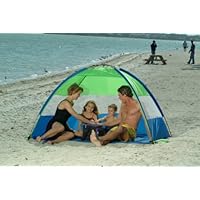 The Sunmate features a sewn in floor, large open front, nylon mesh panels for ventilation. Includes shock-corded fiberglass poles, sand pockets and stakes for extra stability. Comes with carry bag. Measures: 7' wide by 4' tall x 4' deep.Color: Bright Blue and Lime Green.